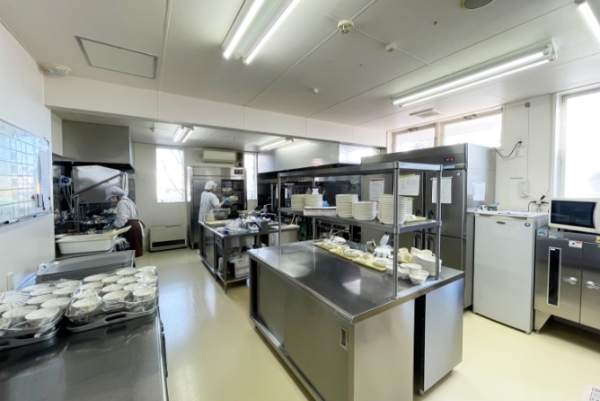 毎日手作りでおいしい給食を作っている調理室です。地産地消を基本に、旬の食材を使った栄養バランスのいい献立になるよう工夫しています。