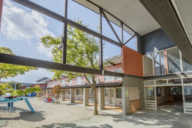 園の正面のピロティでは、毎朝「おはようございます」と子どもたちのあいさつの声が響きます。雨の日でも濡れずに送り迎えができます。