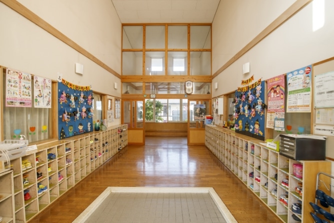 子どもたちの靴箱が並ぶエントランス。十分な広さがあるので、登園・降園や園庭へ出る際にスムースに行き来できます。