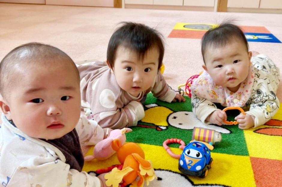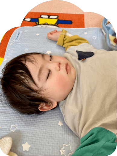 0歳児クラスのエンジェル組は、個々の発育状況にあわせ、健康的でのびのびとした保育を実施しています。保育士による語りかけ読み聞かせや、それぞれのペースに合わせてお昼寝や授乳・離乳食、着替え、オムツ交換を行います。