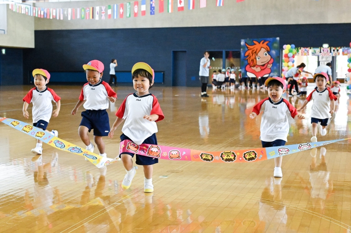 お父さんお母さんと一緒にご褒美まで一生懸命走るエンジェル組。自分の背丈より大きい大玉を転がす年少組。あらん限りの力で綱引きをする年中組。呼吸もピッタリ見事に決まる年長組の組立体操。すべて成長の記録です。最後に園長先生からいただく金メダル!