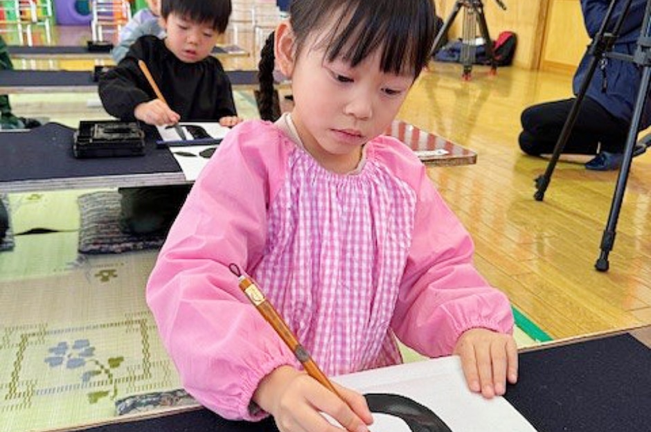 何事においても「興味を示した時が最大の教育効果」と捉え、当園では4歳児より文字指導を行い、5歳児には全国的にも類を見ない「毛筆学習」へと系統的に進めています。教室への入退室の作法、お稽古の最初と最後のあいさつ、全て忘れて一心に一本の線に集中する冷静沈着な態度など、情操教育の一環としての役割も大きいものがあります。