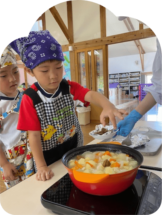 調理することは、視覚・嗅覚・聴覚・触覚・味覚の五感全てを使った活動です。みんなで調理をすることは、食に対する興味が深まり、好き嫌いを減らすきっかけにもつながります。